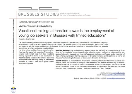 The French-speaking professional training system in Brussels significantly improves the opportunities for the professional integration of participants, in particular with respect to vocational training. The possible impact of this – particularly as a second chance for young people with the lowest qualifications – is, however, limited by the recruitment practices of companies. While they generally favour those who have undergone vocational training, other criteria are taken into consideration when there is a shortage of job vacancies. The most vulnerable youth benefit less from their vocational training, especially in terms of job stabilisation. It therefore seems necessary to combine economic development and the safeguarding of educational pathways in order to take action against unemployment in Brussels.