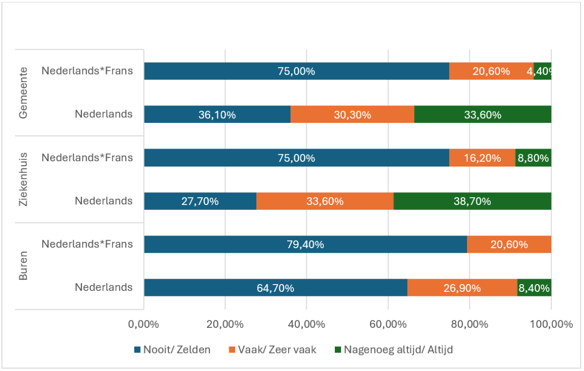 Het algemeen taalbeeld van Brussel wordt sterk bepaald door de ‘zichtbare’ contacten die men dagelijks observeert in diverse taaldomeinen van de Brusselse samenleving. Hierbij bestaat de perceptie dat er weinig tot geen ruimte is voor het Nederlands in Brussel. Dit kan echter sterk verschillen naargelang de formaliteit van het beschouwde taaldomein. Het taalgebruik is immers verschillend naargelang het gaat over het informele domein, zoals met vrienden of buren, in semi-formele organisaties zoals ziekenhuizen, dan wel informele administraties zoals de gemeente. Afhankelijk van de situatie maakt men een bewuste taalkeuze, afgestemd op de context. De keuze wordt vaak bepaald door de perceptie van (in)formaliteit, intimiteit, machtsverhoudingen en gelijkheid ten opzichte van hun gesprekspartner. In Figuur 1 vergelijken we daarom voor TBB5 het gebruik van het Nederlands door Nederlandstaligen in drie taaldomeinen: met gemeenteambtenaren, in ziekenhuizen en met buren. We richten ons daarbij op de relatieve frequentie van het taalgebruik door zowel eentalig Nederlandstaligen als traditioneel tweetaligen (Nederlands/Frans), om inzicht te krijgen in hoe deze groepen het Nederlands hanteren in verschillende contexten.